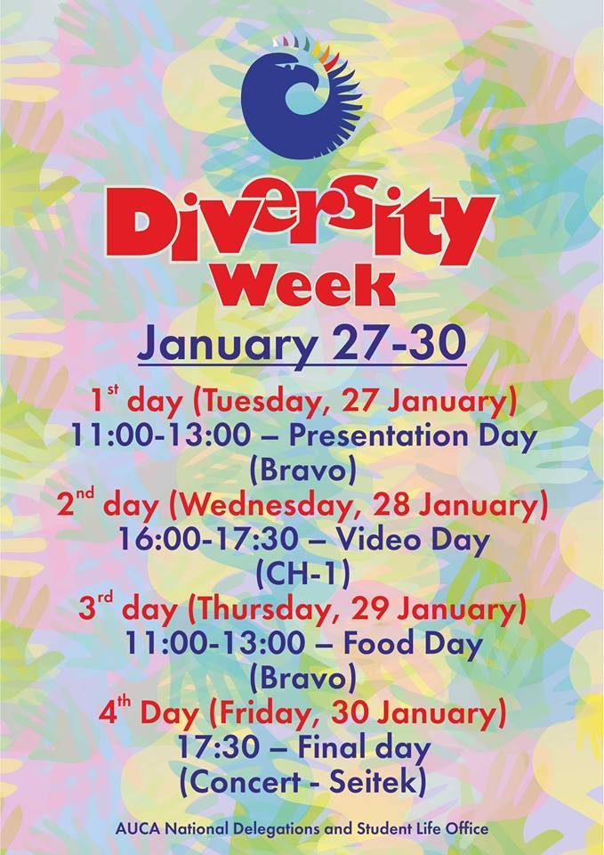 Don’t be surprised this week when you will meet a crowd of students wearing Kyrgyz jelek, kalpak or koinok and see them dancing everywhere and singing; or when you will notice students preparing French, German,Korean, Uzbek, Tajik or Indian food. This is just Diversity Week coming!